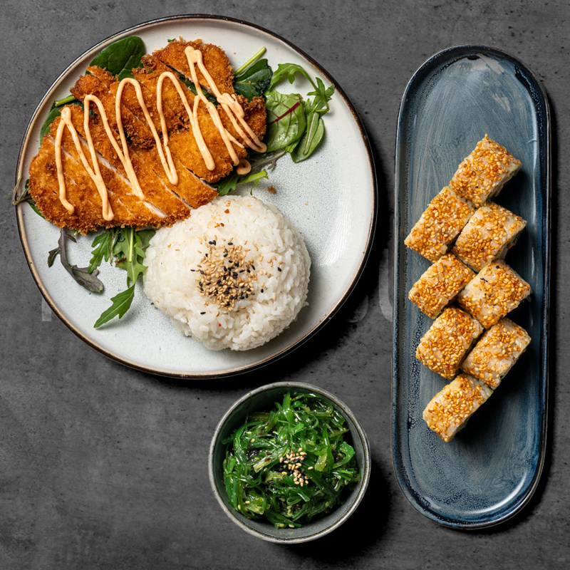 tangsalat. Tempura kylling bryst med ris. ceispy Ebi. M.chilimayo