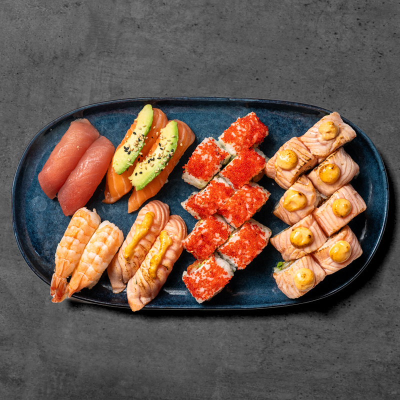 Nigiri: 2 stk. laks m.avocado, 2 stk. flamberet laks, 2 stk. rejer, 2 stk. tun